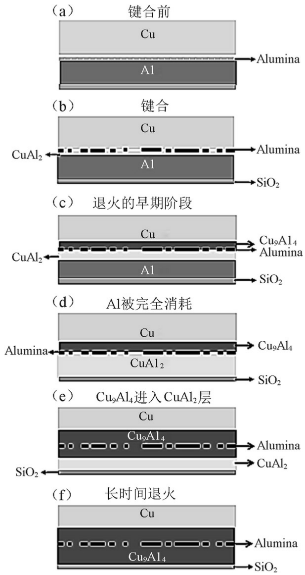 (a)未键合前初始氧化铝(Alumina)薄膜;(b)CuAl 2 在键合过程中生成;(c)Cu 9 Al 4 出现;(d)Cu 9 Al 4 和CuAl 2 同时生长;(e)Cu 9 Al 4 通过消耗CuAl 2 继续生长;(f)Cu 9 Al 4 成为最终的化合物产物