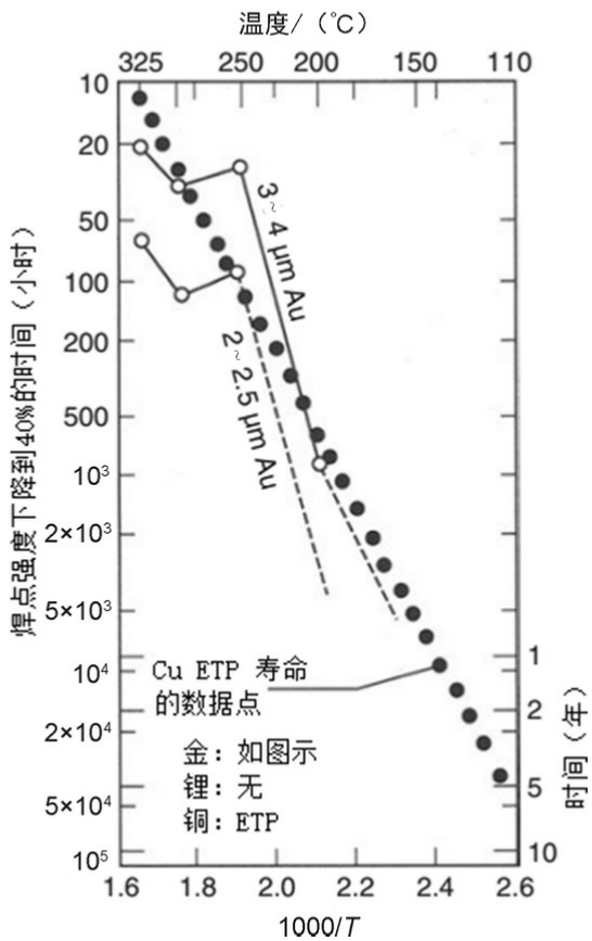 Au-Cu界面可形成三种韧性金属间化合物Cu 3 Au、AuCu和Au 3 Cu,所需的活化能为0.8~1eV。一些研究发现,Au-Cu化合物中有类似柯肯德尔孔洞的孔洞 [18] 。一些研究在空气和真空条件下使用热压键合方式制备Au-Cu键合焊点,发现随着时间和温度的增加,界面处出现的孔洞会使得焊点结合强度明显下降。不同温度下焊点键合强度下降到40%的时间如图3-8所示。图3-8以键合强度下降到40%为失效依据,预测一个器件在100℃环境下工作的寿命约为5年。由此可以看出,对于大多数电子产品,Au-Cu键合能够满足寿命要求 [19] 。其他研究发现,当Au在厚Cu焊盘上进行热压键合时,在150℃存储3000小时后,键合强度几乎不变。