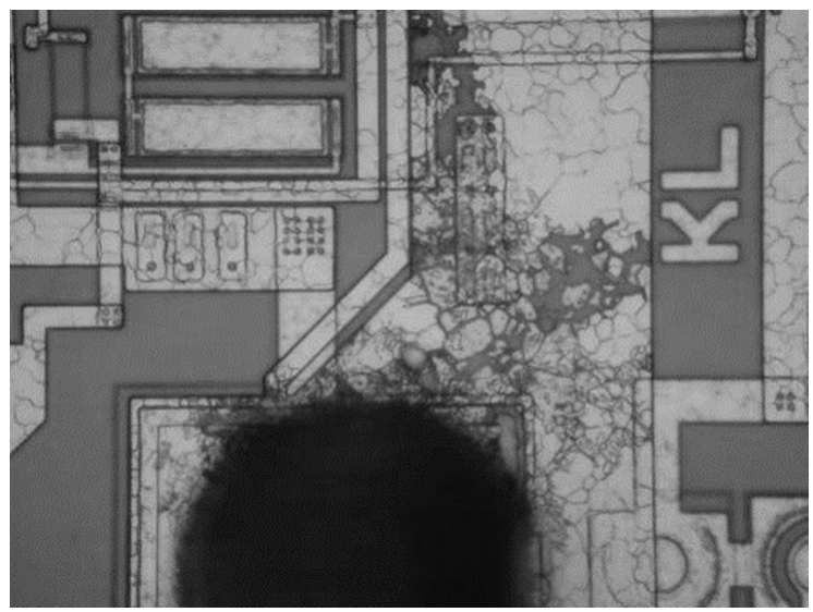 模塑料的热分解产物会对Au-Al金属间化合物进行化学腐蚀,影响最大的热分解产物是环氧树脂或阻燃剂释放出的溴或含溴分子。溴分子(如HBr、CH 3 Br)与金属间化合物的腐蚀反应会减弱键合的机械强度、增加界面电阻。另外,湿气和氧气的存在会加速键合退化的速度。例如,氧气的存在导致热氧化分解和明显加速引线的退化和失效。相比于在空气中,键合引线在真空中的退化速度明显降低。塑料树脂在湿气环境中吸收湿气,导致模塑料膨胀和玻璃化转变温度的降低,这方便了腐蚀性分子传递到键合区域,并增大了塑料封装的失效速率。长时间暴露在高温下,会导致孔洞不断增加,键合变得脆弱、电阻增加,造成电路的失效。