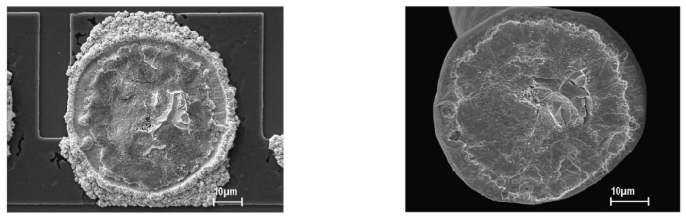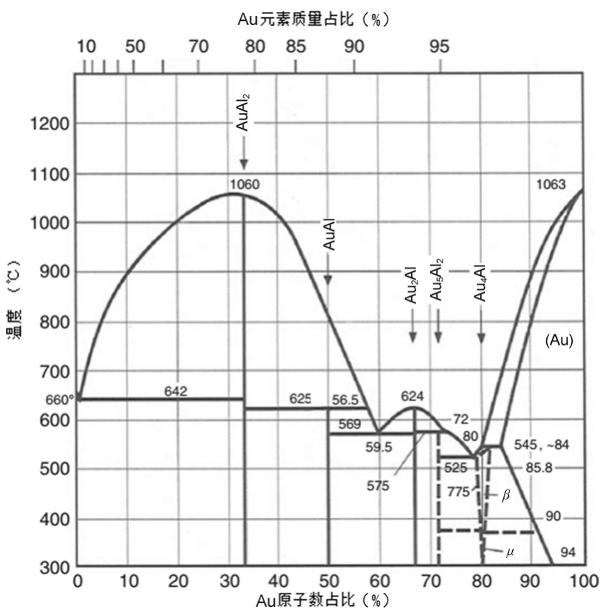 Au-Al键合失效的机理包括Au-Al金属间化合物(Intermetallic Compound,IMC)相的形成,它们随时间转变成化合物(Au 4 Al或Al 5 Au 2 ),在Au-Al金属间化合物或键合界面处形成孔洞,这种孔洞是由于Au原子和Al原子扩散速率不同而产生的。由于金属间化合物的存在,键合强度变得更高了,但由于Au-Al金属间化合物的体积改变,Au-Al引线键合变得更易碎和更易产生机械应力。