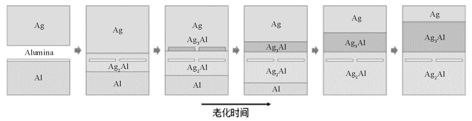 对于Ag-Al金属间化合物在高加速应力试验(HAST)中的演变,通过TEM观察并分析化合物的形貌及结构。Ag-Al金属间化合物的演变过程如图3-9所示,初始形成的相是Ag 2 Al,Al(镀)层中氧化铝被包裹在Ag 2 Al层中。随着时间的延长,Ag不断向Al层扩散,Ag 2 Al厚度增加,同时Ag 3 Al形成,Ag 2 Al和Ag 3 Al的厚度不断增加直至将Al层耗尽。