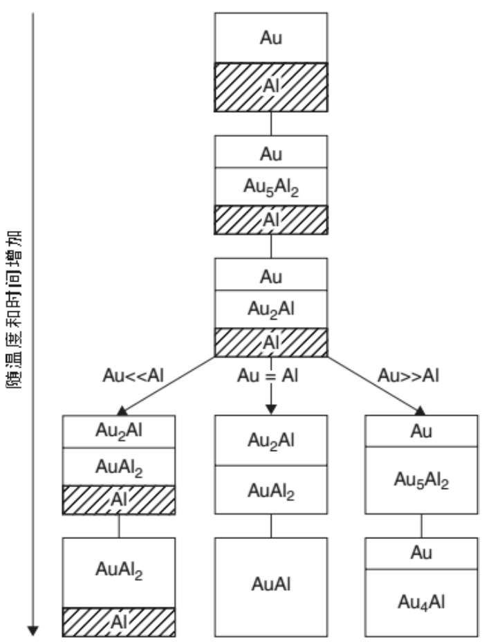 金属间化合物的演变由扩散效应决定。一种金属扩散到另一种金属的速率由晶格中的缺陷数量决定,这些缺陷包括空位、位错、晶界。Al等其他金属可以通过Au层晶界快速扩散到Au中。图3-5所示为Au-Al薄膜系统化合物形成和演变过程。分别观察在富Au、富Al和Au、Al含量相当时化合物的生产及演变 [5] 。最终化合物的成分由老化的温度和初始元素含量确定。若提高温度和延长时间,中间化合物的成分及比例会发生变化。而不同化合物的热膨胀系数不同,当化合物转变时,会产生应力导致裂纹的产生,最终导致键合失效。
