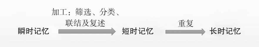 图1-1 瞬时记忆、短时记忆和长时记忆的转化