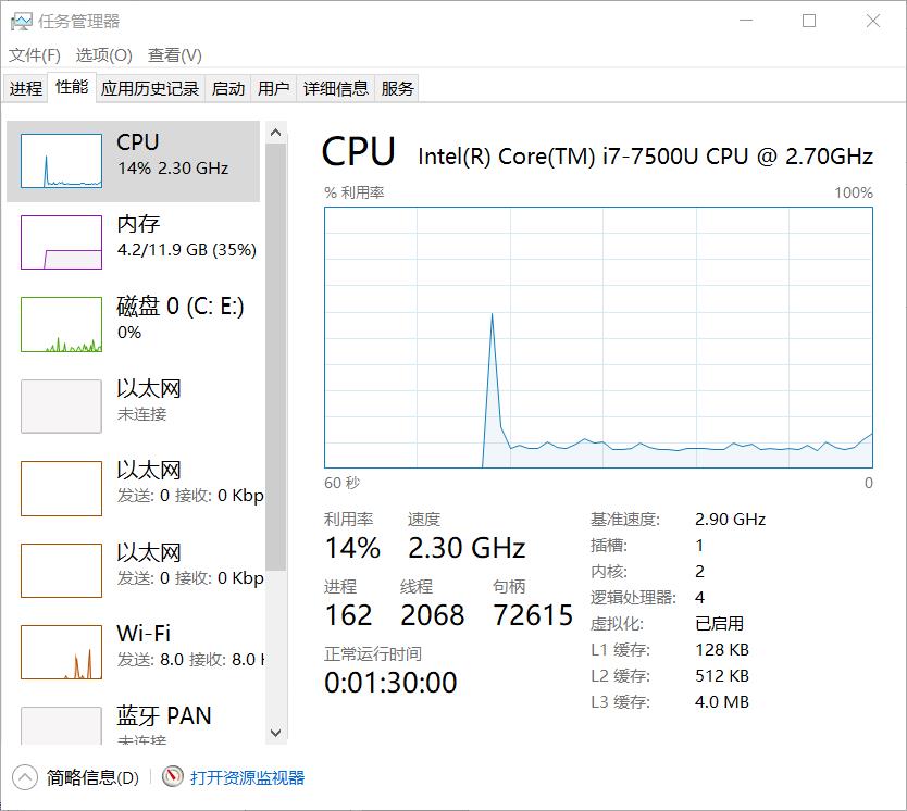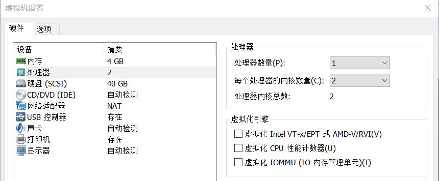 在“性能”标签下,可以看到作者所用的计算机的CPU配置。其中,插槽为1(也就是只有1个CPU);内核为2;逻辑处理器为4。所以在选择虚拟机处理器时,其内核数要低于4。