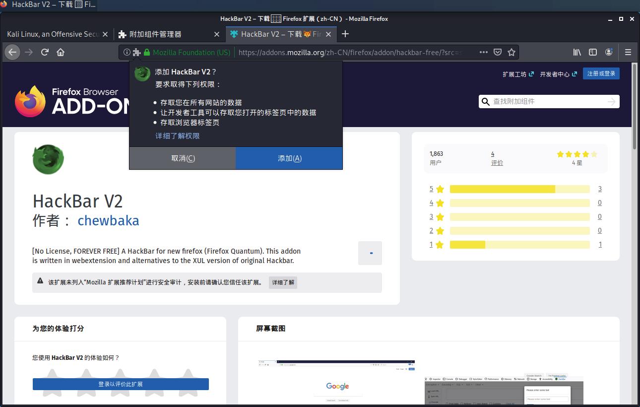 除了安装HackBar插件,我们还可以根据需求在Firefox中安装其他插件。限于篇幅,这里不再展开介绍。