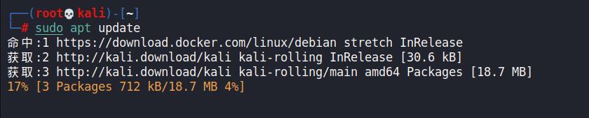 接着,在终端中输入命令sudo apt update更新软件源地址,以便更新Kali Linux系统和工具的软件源,如图1.25所示。