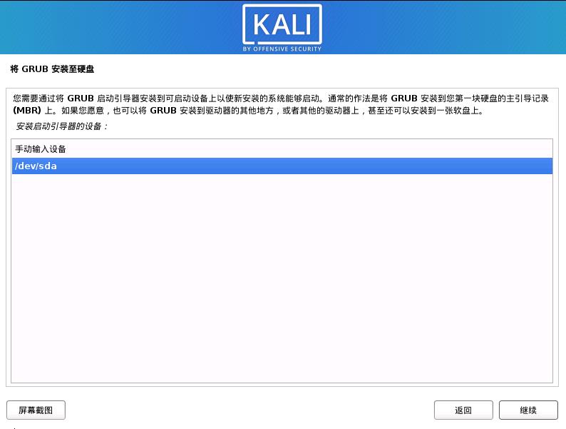 之后,系统会显示要安装GRUB的设备,我们选择/dev/sda来安装GRUB启动引导器,如图1.22所示。