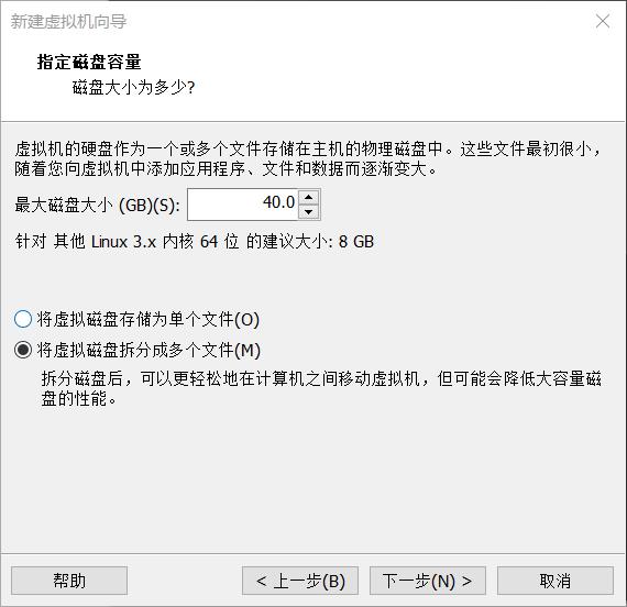 然后需要设置虚拟机的磁盘大小。如果经常使用,可将“最大磁盘大小”设置为40GB。如果只是偶尔使用,建议设置为 20GB。这里设置为 40GB,其他选项保持默认,如图 1.9所示。