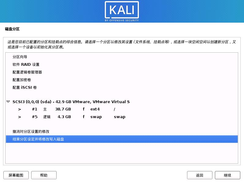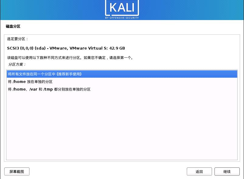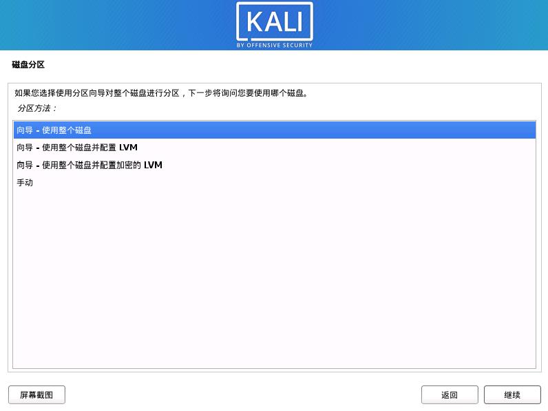 注意: 如果是将Kali Linux安装在物理机上,则建议手动分区后进行安装,以便形成双系统。