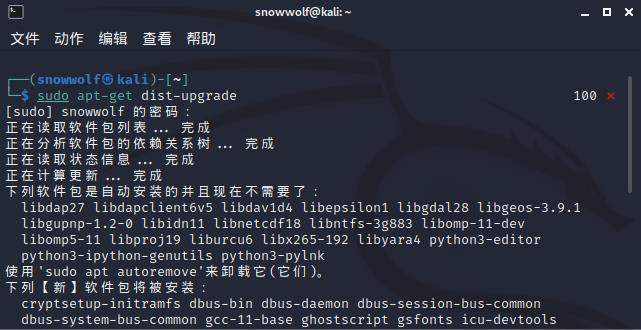 在软件包更新完成后,可以继续更新系统包。为此,输入命令sudo apt-get dist-upgrade更新系统,如图1.27所示。