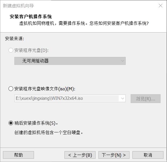 接下来将会弹出“安装客户机操作系统”界面,在这里可以选择以哪种安装方式进行安装。我们选择稍后“安装操作系统”(见图1.6),然后单击“下一步”按钮。