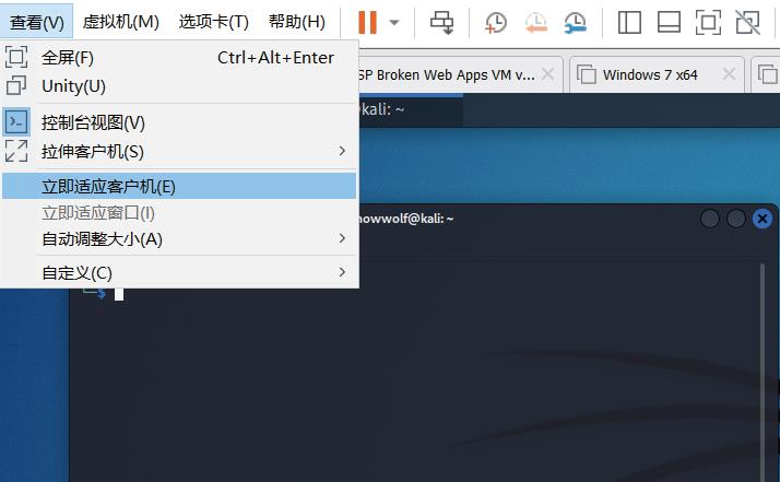 在Kali Linux系统安装完毕后,其界面一般不会铺满整个屏幕。此时,需要单击屏幕左上角的“查看”菜单,从中选择“立即适应客户机”命令,如图1.28所示。之后,Kali Linux的界面就可以铺满整个屏幕了。