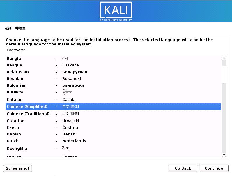 这里选择Graphical install选项,系统跳转到安装语言选择界面。在该界面中选择“中文(简体)”,然后单击Continue按钮,如图1.16所示。