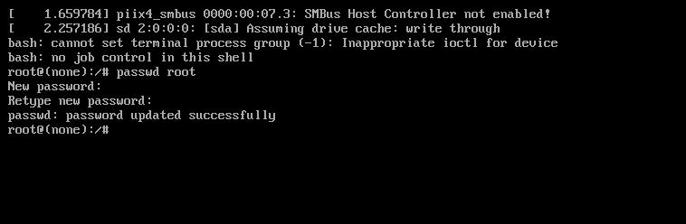 在图1.33中可以看到,当前已经切换到root用户。但是我们并不知道root用户的密码,为此需要手动修改。可输入命令passwd root,修改root的密码,如图1.34所示。