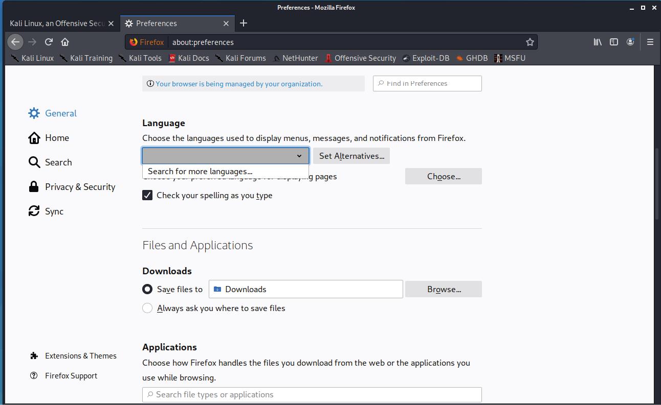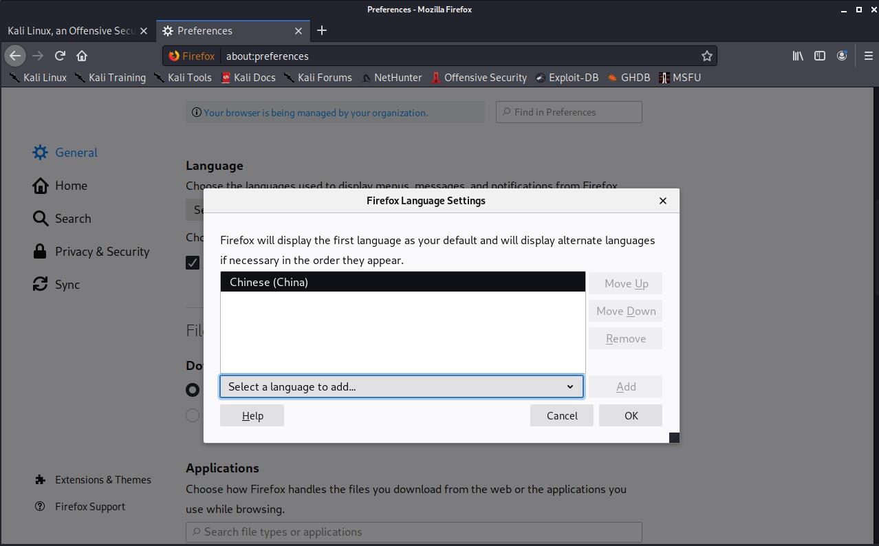 由于Kali Linux自带的Firefox是英文版,我们可以将其修改为中文版。为此,单击FireFox右上角的应用菜单图标,在弹出的菜单中选择Preferences。然后在弹出的界面中找到Language选项,单击空白框,从中选择Search for more languages,如图1.36所示。