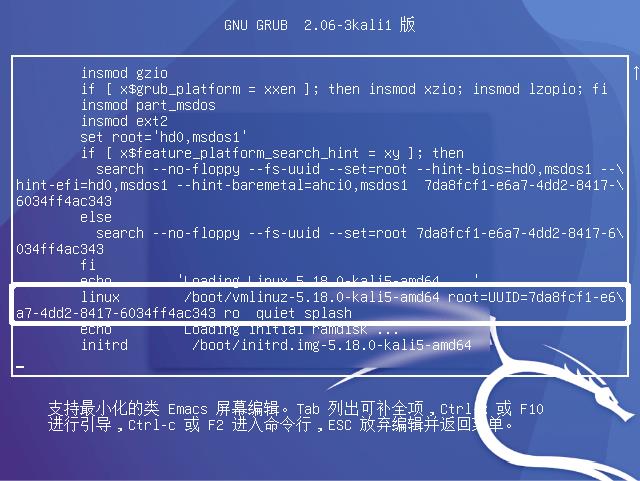 第二种方式是在终端中输入命令sudo reboot重启Kali Linux,在出现如图1.30所示的界面时,快速按下键盘上的E键,进入如图1.31所示的环境修改界面。