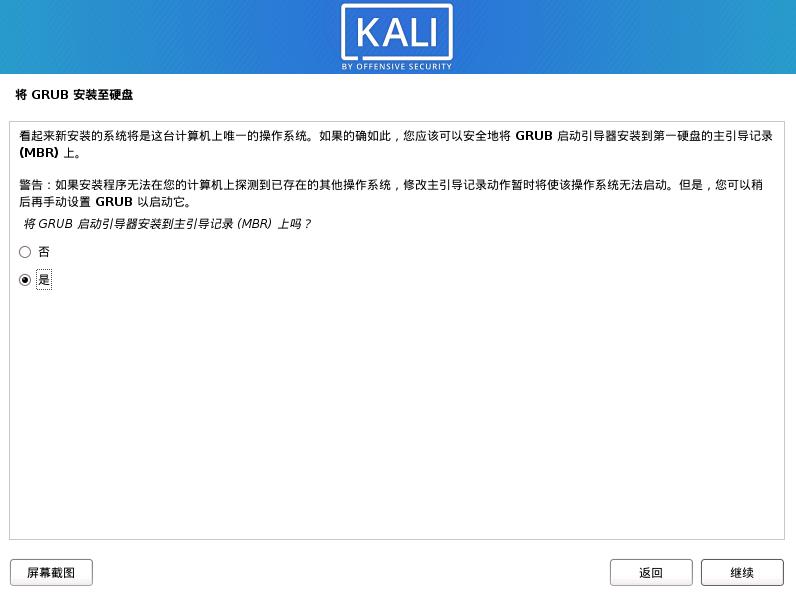 安装完选择的软件之后,系统会询问“将GRUB启动引导器安装到主引导记录(MBR)上吗?”,我们选择“是”即可,如图1.21所示。