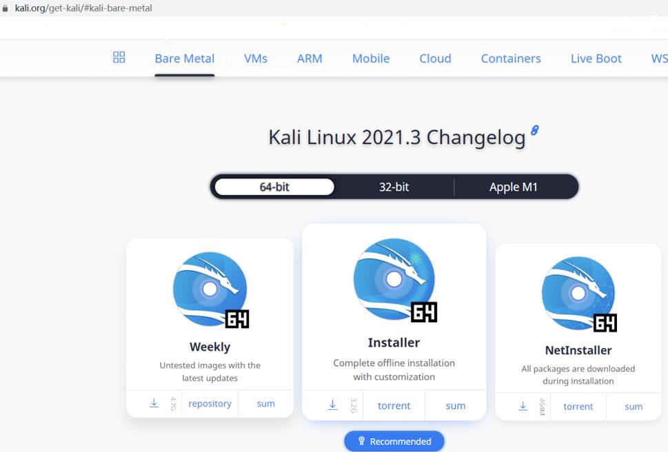 单击DOWNLOAD按钮,跳转到Kali Linux的下载界面,然后单击Bare Metal标签即可跳转到Kali Linux镜像下载界面。在Kali Linux镜像下载界面,单击Installer按钮,即可下载Kali Linux的镜像文件,如图1.2所示。