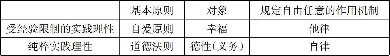 本章已经用大量篇幅讨论了自爱,亦即受经验限制的实践理性的第三个环节。然而,除了作为其基本原则的自爱之外,受经验限制的实践理性实际上还拥有幸福和他律这两个环节,而它们又分别是属于该理性的(作为其系统化之整体的)对象,以及这种理性用以规定自由任意的特定作用机制。若仅仅就其自身而言,受经验限制的实践理性中的这三个环节,从道德的角度来看都是无罪的,或者说,这三个环节在道德上都是中性的。然而在人这里,实践理性不仅能够在受到经验限制的条件下得到运用,也能够脱离经验的限制而得到一种纯粹的运用。进一步地说,纯粹实践理性也可以被划分为三个环节,这三个环节分别是作为其基本原则的道德法则、作为其对象的德性(或义务)和作为其规定自由任意的特定作用机制的自律。总而言之,受经验限制的实践理性和纯粹实践理性所各自拥有的三个环节之间的对应关系,可以用下面这张表格来表示: