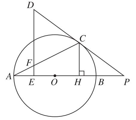 2.如图21-2所示,AB为☉O直径,AC为☉O的弦,过☉O外的点D作DE⊥OA于点E,交AC于点F,连接DC并延长交AB的延长线于点P,且∠D=2∠A,作CH⊥AB于点H.若HB=2,cos∠D=
