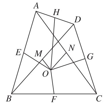 12.如图23-7所示,凸四边形ABCD的四边中点为E、F、G、H,对角线中点为M、N,过M作AC平行线,过N作BD平行线,交于O点,证明:线段OE、OF、OG、OH将四边形ABCD的面积四等分.
