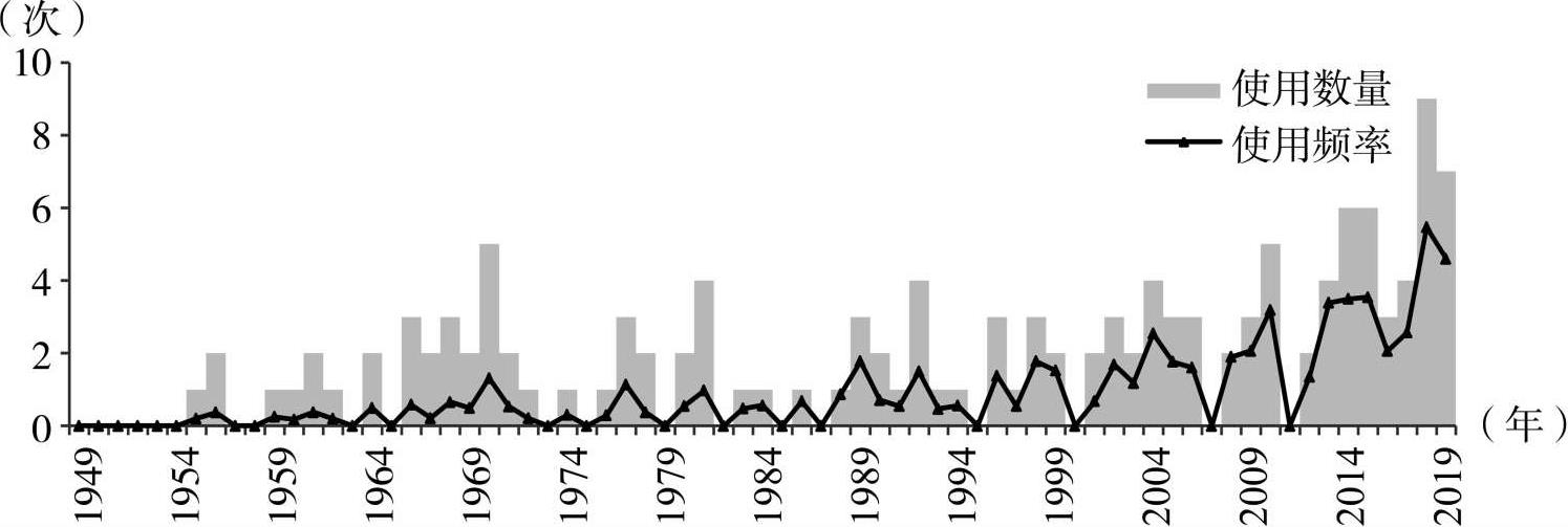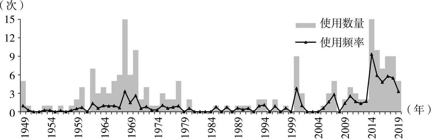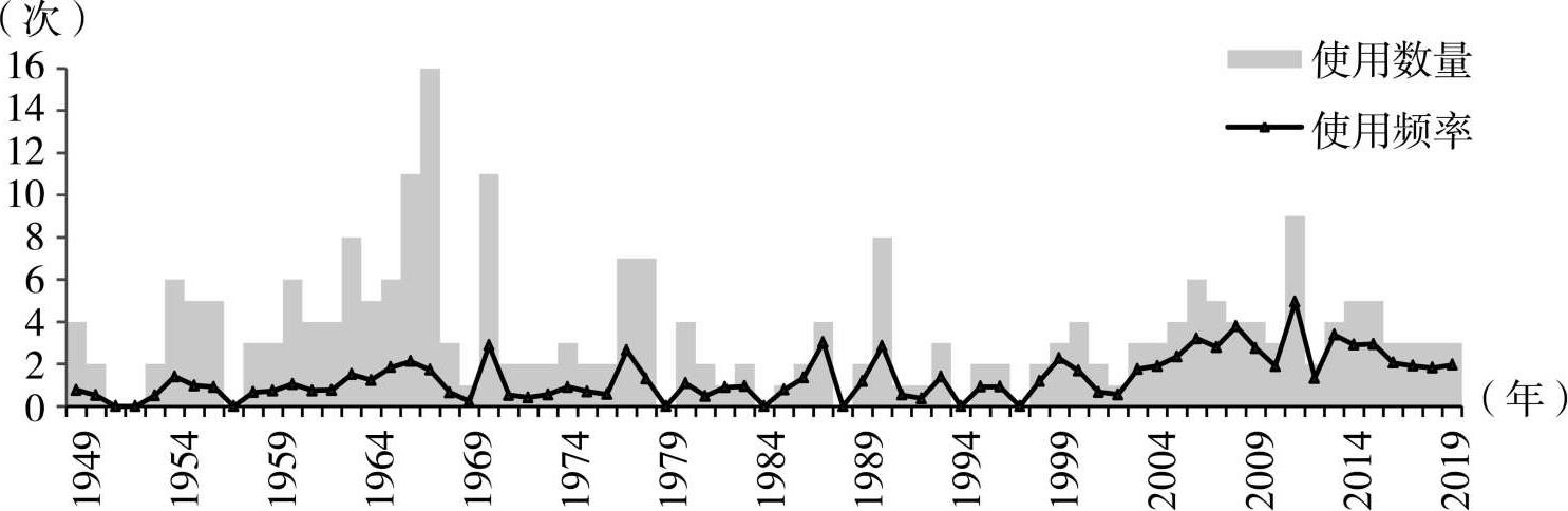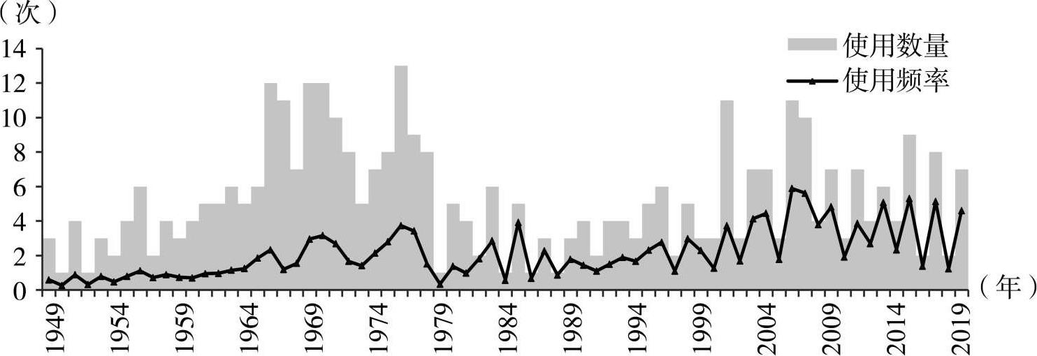 图4 1949—2019年《人民日报》元旦社论反复辞格的使用数量及每千字使用频率