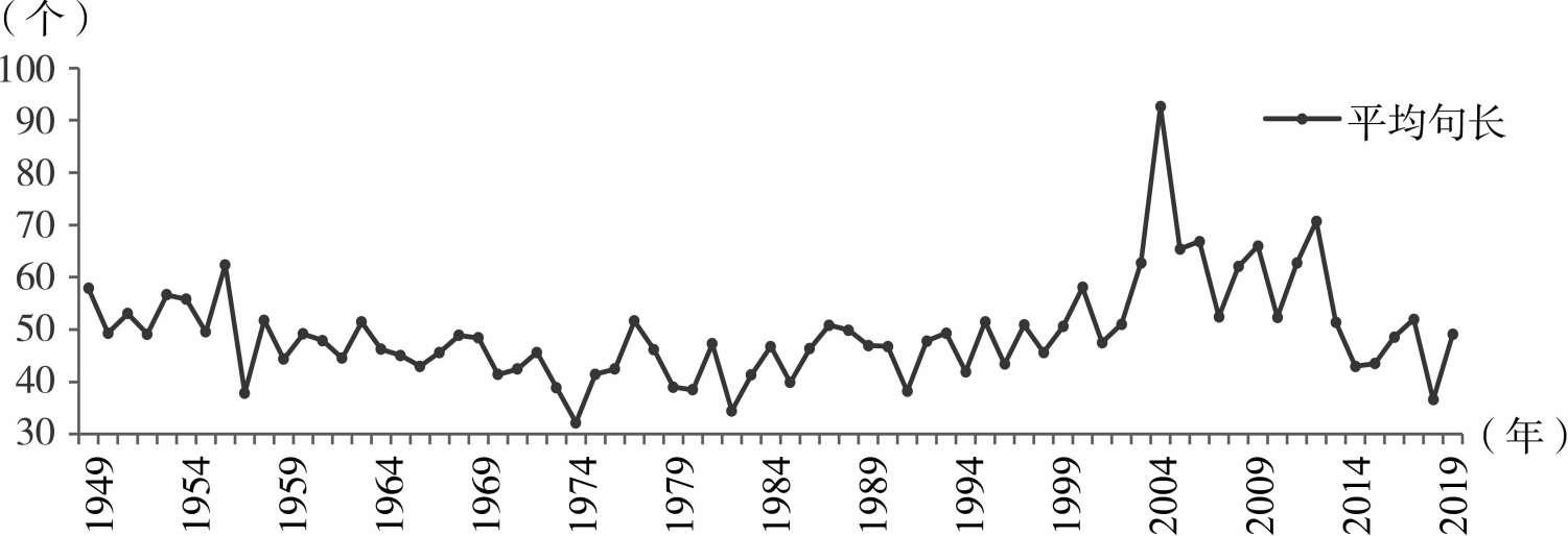 1949—2004年,随着社会发展,思想认识丰富,语言表达缜密,元旦社论平均句长呈增长趋势,2004年达到最高点。此后,元旦社论平均句长又有回落,总之整体较为稳定。我们认为,元旦社论的句长受到时代风格、表达内容、执笔作者等多种因素的影响,今后还需作进一步深入分析。