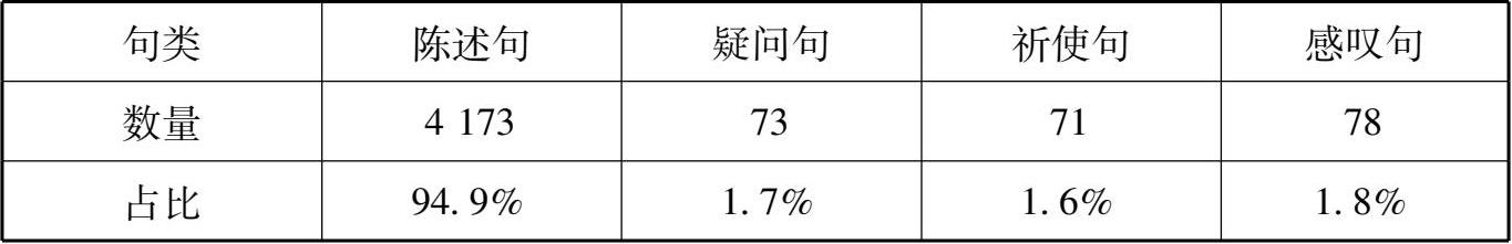 元旦社论的主要目的就是向人们总结过去一年取得的成绩,展望新一年的工作任务,所以陈述句使用量远高于其他句类,其他三种类型的使用数量均少于100次,且占比非常接近。