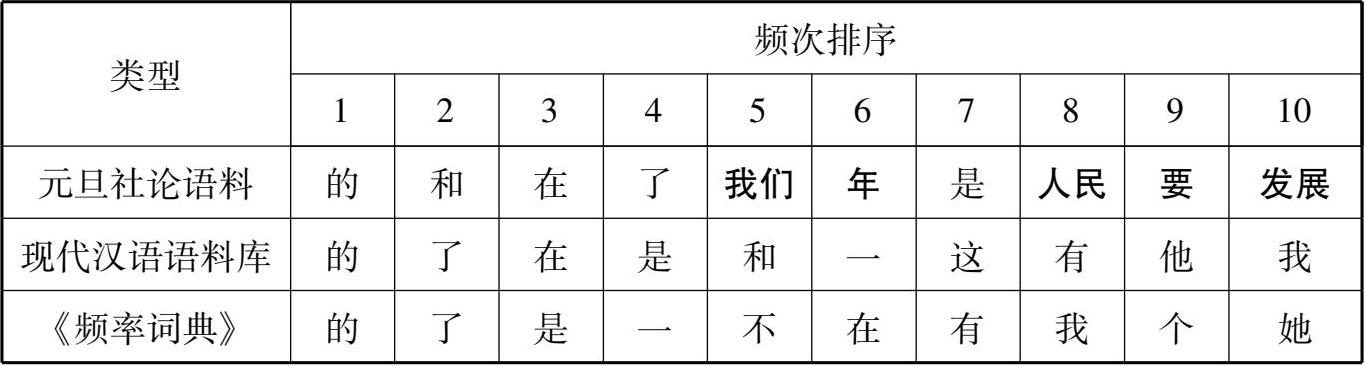 我们以现代汉语语料库词语频率表、《现代汉语频率词典》(以下简称《频率词典》)作为对照,整理前10位高频词对比的结果,发现“我们”“年”“人民”“要”和“发展”是元旦社论独有的高频词。