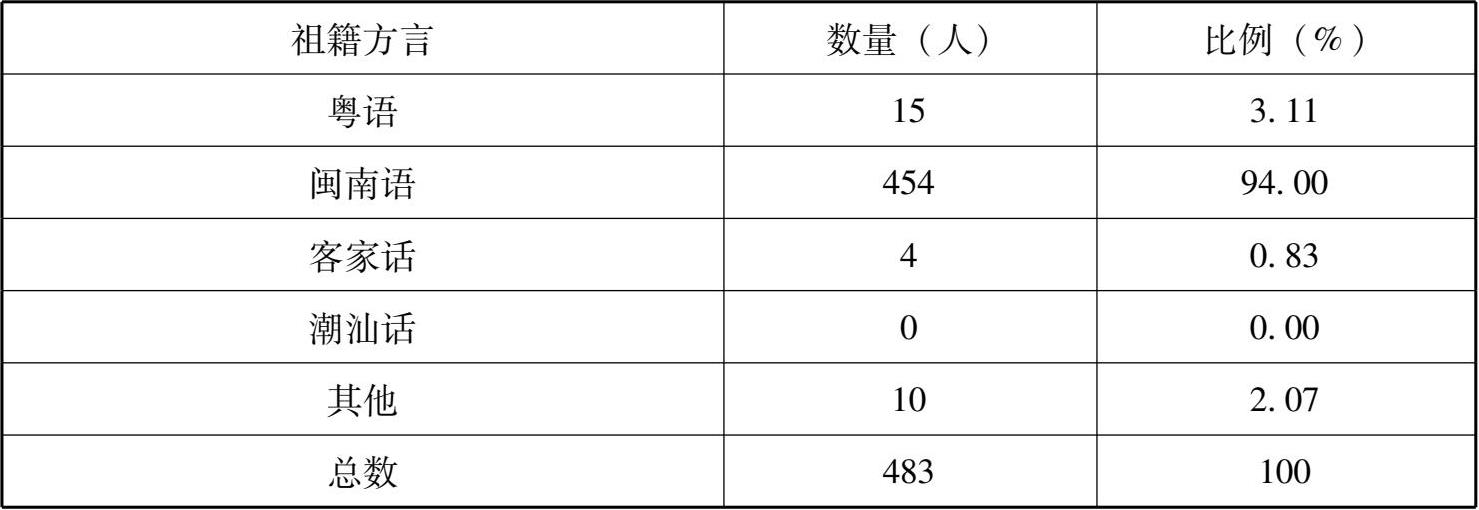 菲律宾大多数华人来自福建。根据调查结果,调查对象中有 454人的祖籍方言是闽南语,有 15人的祖籍方言是粤语。