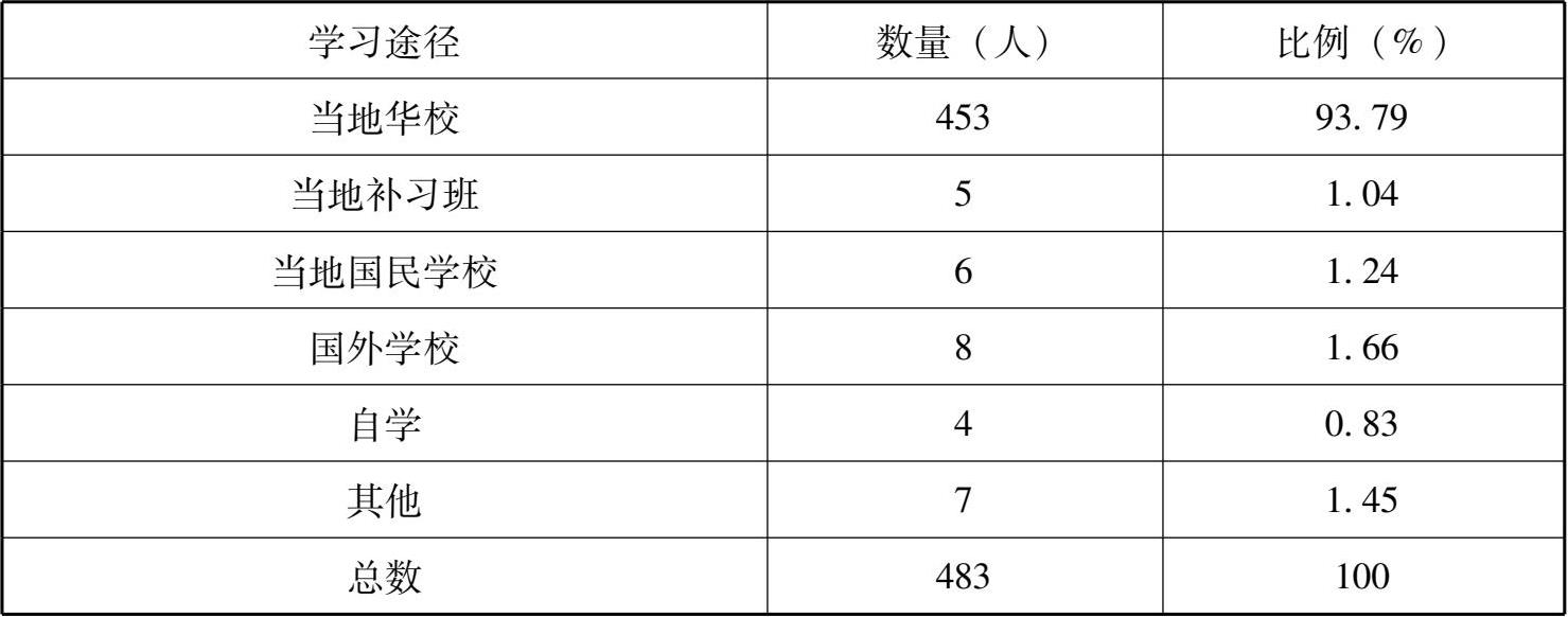 近年来,华文教育在菲律宾持续发展。菲律宾兴起了开办华文学校和华文补习班的热潮。关于菲律宾华人学习华语途径的调查结果如表 4-7: