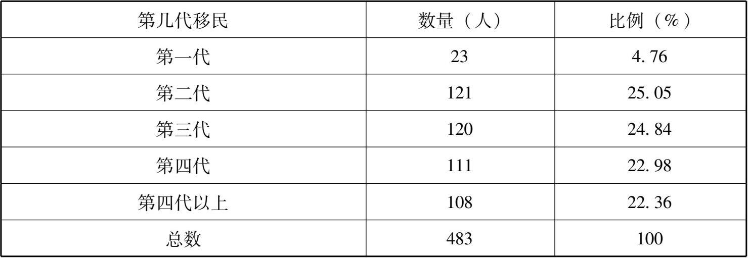 调查结果显示,调查对象中很少有人是第一代移民,而第二代、第三代、第四代和第四代以上的数量大致相当。