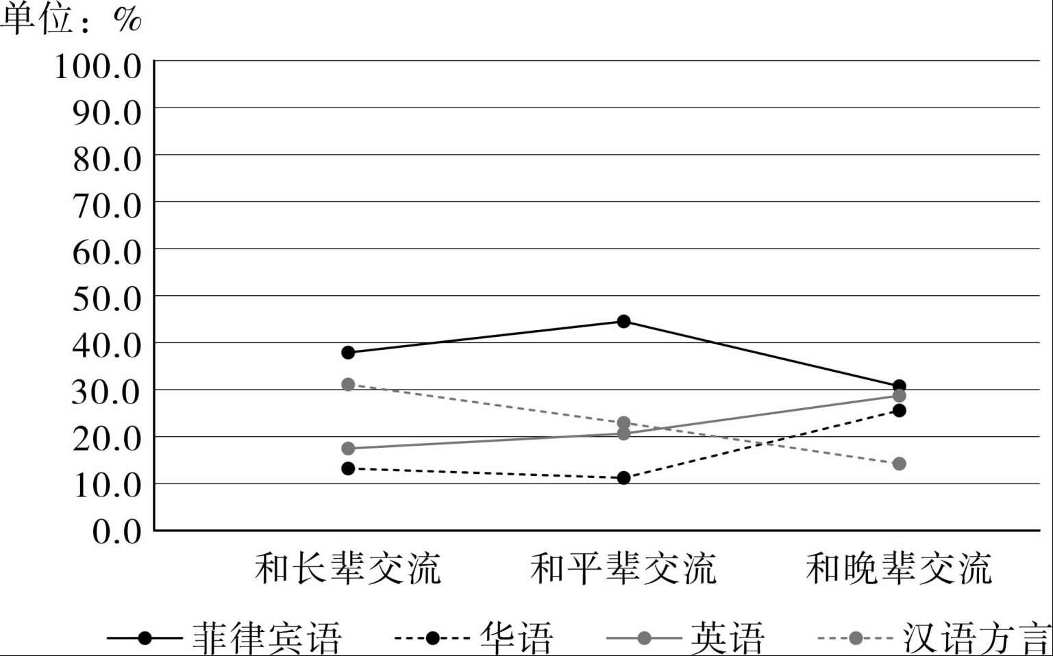 调查结果显示,菲律宾华人与晚辈交流使用的语言并不集中,除汉语方言使用比例较低(14.16%)以外,其他语言使用的情况大致相当。由此可见,菲律宾华人在教育下一代时,对语言的要求比较灵活多样。