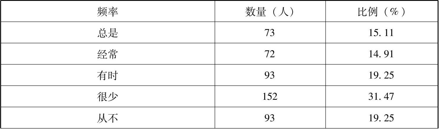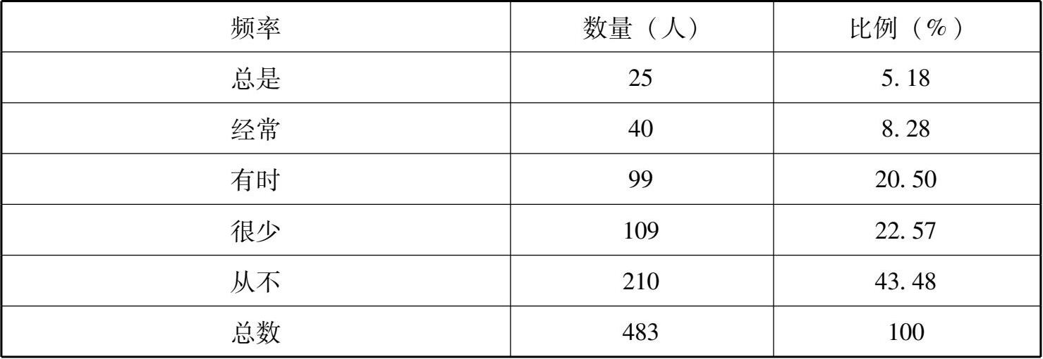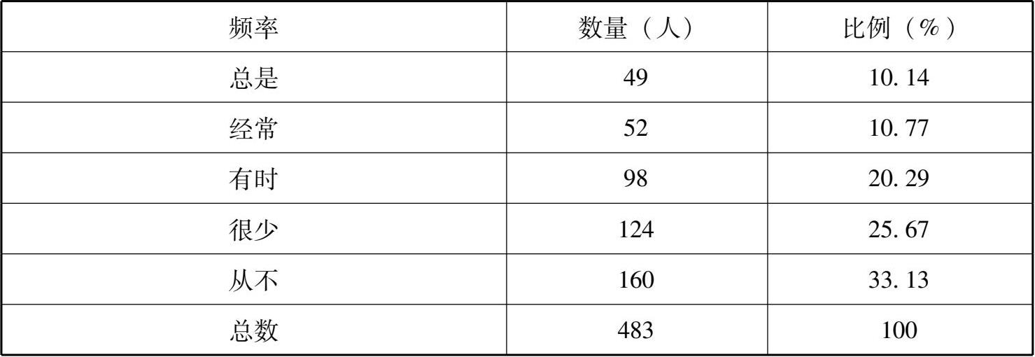 菲律宾的华文报纸发行范围主要在马尼拉,在其他城市的数量较少。调查结果显示,菲律宾华人阅读华文报刊书籍的频率较低,从不和很少阅读的共占58.80%。总是和经常阅读的人很少,分别占 10.14%和 10.77%。这说明,大多数的菲律宾华人没有阅读华文报刊书籍的习惯。