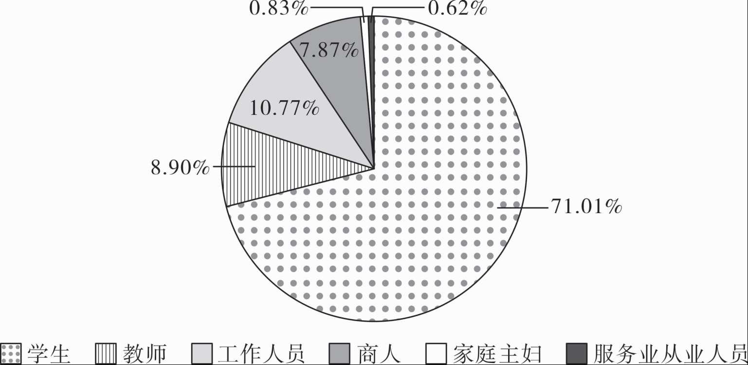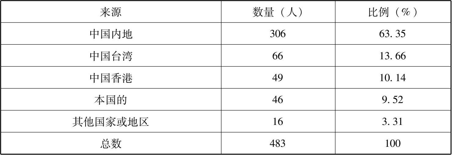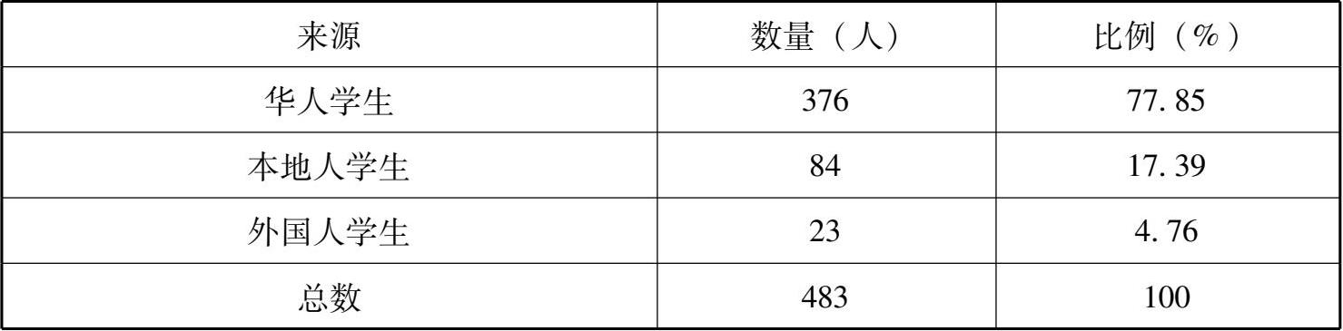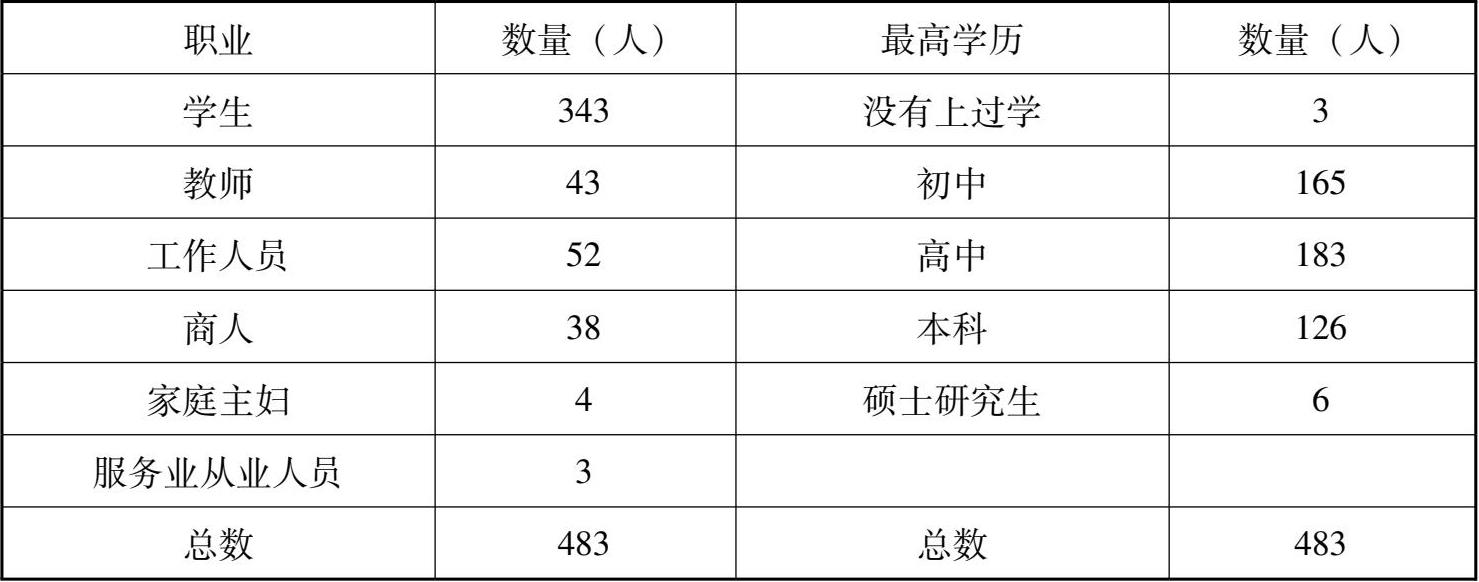 调查结果显示,调查对象大多数是学生,有 343人(含大学生),此外还有社会工作人员 52人,华文教师 43人,商人 54人,家庭主妇 5人,服务业从业人员 3人。他们的最高学历大多数都为高中,有 183人,此外还有本科 126人,初中 165人,研究生 6人。
