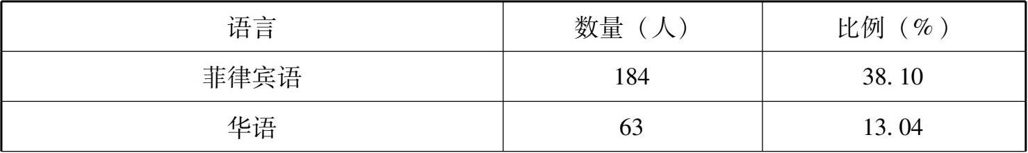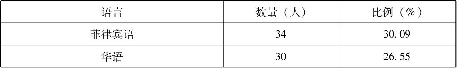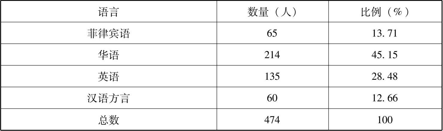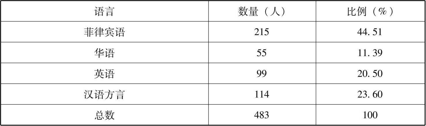 (1)华人以使用菲律宾语为主,但汉语方言的使用依然十分广泛,闽南语是华人群体使用的主要方言。菲律宾华人在华人社区中的互相交流以使用菲律宾语为主,但也大量使用方言。这与菲律宾华人大多已经是第三、四代华人,甚至有不少与菲律宾当地人通婚的混血儿相关。这说明华人已基本融入了菲律宾的社会。