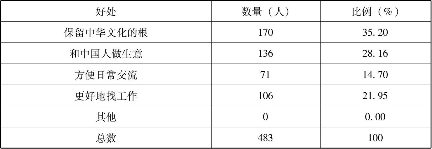 根据以上结果,可以看到最多人选择的是“保留中华文化的根”,共有 170人,占 35.20%;第二是“和中国人做生意”,共有 136人,占 28.16%;第三是“更好地找工作”,共有 106人,占 21.95%;最后是“方便日常交流”,共有 71人,占 14.70%。从中可以看出,实用价值是菲律宾华人认为华语具有的最大的好处,“和中国人做生意”和“更好的找工作”两个选项体现的是华语的实用价值,选择的人超过一半。值得注意的是,“保留中华文化的根”也是选择的人较多的选项。可以看出菲律宾华人在注重华语的实用价值同时,也关注自身的身份认同。