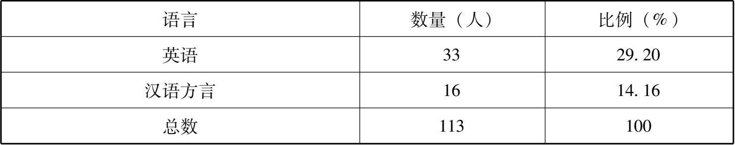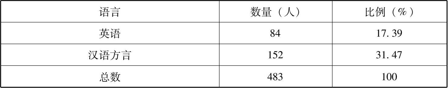 由表可知,选择华语或汉语方言的有 274人,占 57.81%,占比超过半数。其中选择华语的有 214人,占 45.15%;选择汉语方言的有 60人,占 12.66%。选择英语的有 135人,占 28.48%。选择菲律宾语(他加禄语)的有 65人,占13.71%,人数最少。