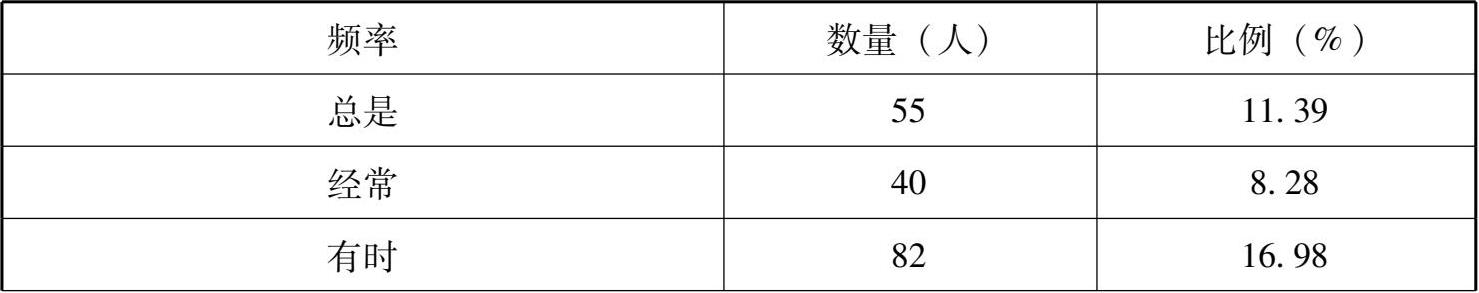 调查结果显示,菲律宾华人基本不收听华语广播。从不或很少收听华语广播的菲律宾华人占大多数,达总人数的 66.05%,其中从不收听的有 210人,占43.48%。总是或经常收听的人数很少,仅占 13.46%。由此可见,菲律宾华人普遍没有收听华语广播的习惯。