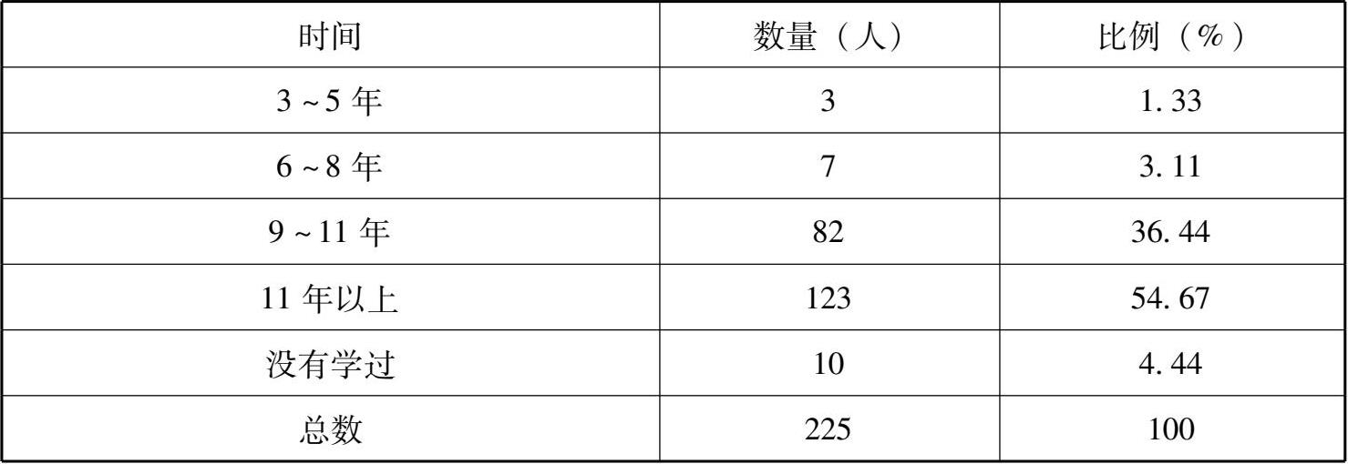 调查结果显示,有 54.67%的人有 11年以上的华语(包括方言)学习经历。这可以说明大部分菲律宾华人华语学习的时间较长,但是也有 10位没有学过华语的华人,结合上面方言使用情况,这 10位调查对象使用的应该是英语或者他加禄语。