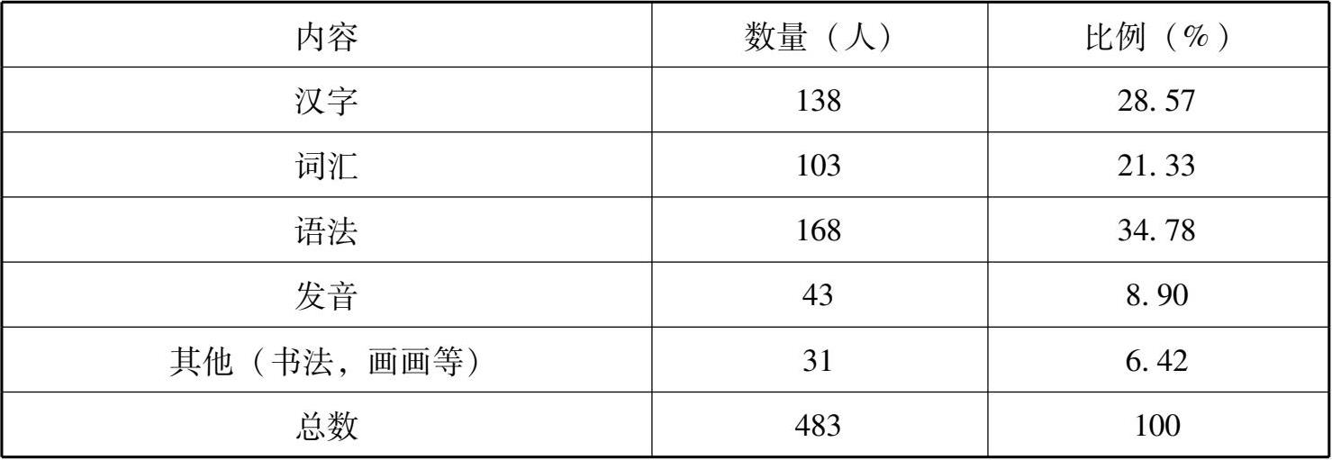 调查结果显示,认为语法最难学的人数最多,有 168人,占 34.78%;第二是汉字,有138人,占28.57%;第三是词汇,有103人,占21.33%。发音和其他对于菲律宾华人而言相对较容易。