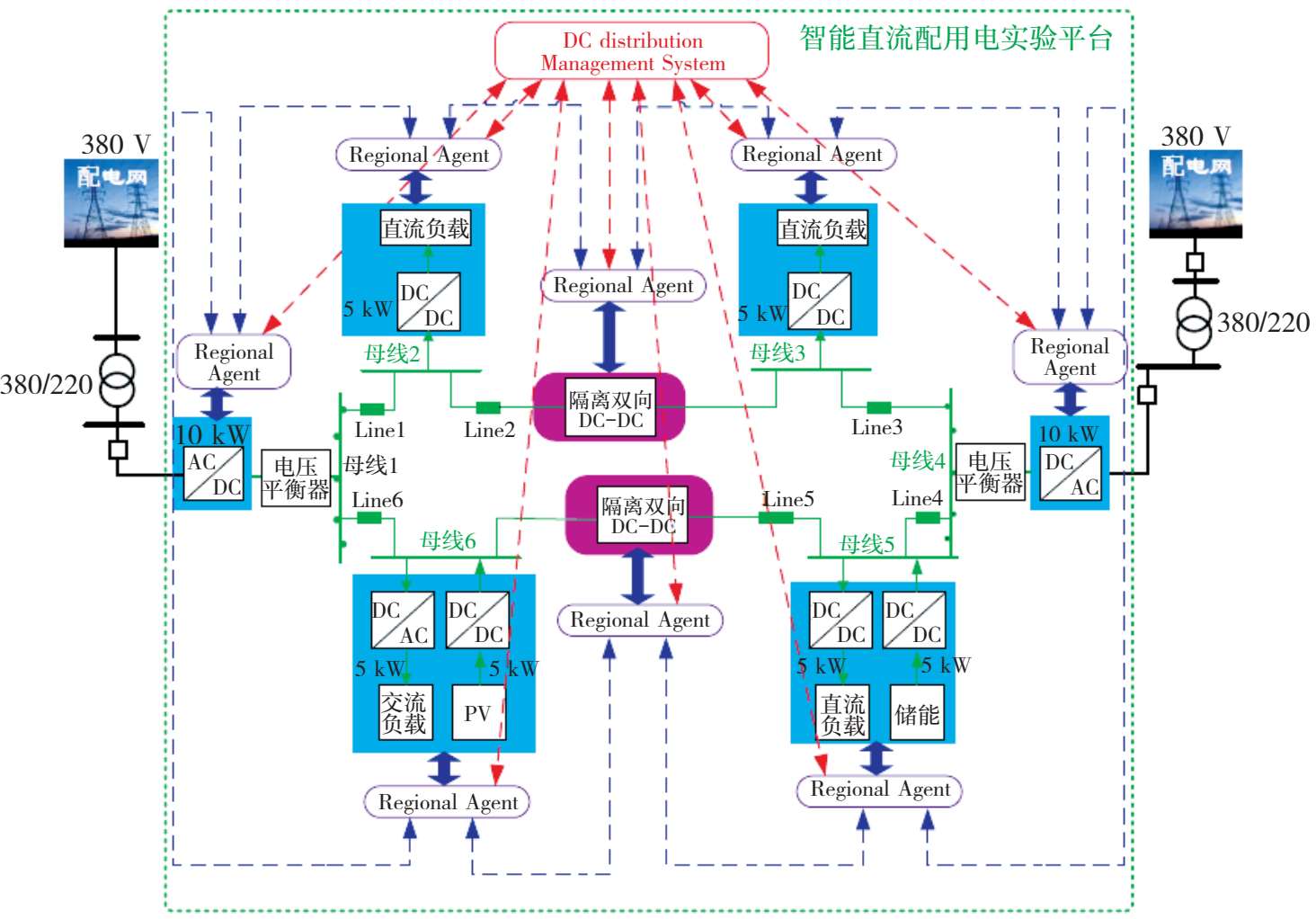北京四方公司提出的微电网分层控制体系结构如图1.6所示。系统分为系统级控制层、设备级控制层和直流微电网物理层。系统控制级实现能量管理与系统的优化运行,包含功率/能量分配、直流母线电压二次调节和运行模式切换的功能;设备控制级实现直流母线电压稳定和系统功率平衡,保证直流微电网稳定运行。包含直流母线电压控制、交直流互联功率控制、交直流负荷电压控制、光伏/直流风机最大功率跟踪、储能单元恒功率/电流充放电控制等功能;直流微电网物理层包含双向DC-AC变流器、交/直流负荷、分布式电源和储能单元等,为系统级控制层和设备级控制层提供物理基础。
