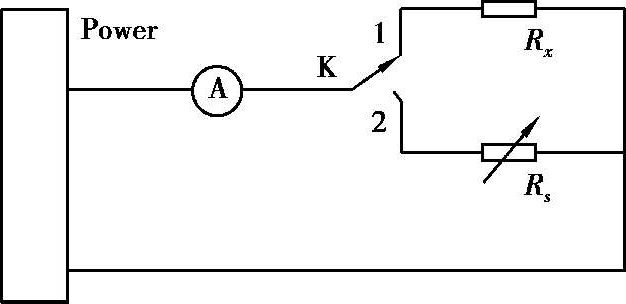 Indirect comparison is used to determine the quantity through an intermediate quantity or calcu lation by formulas. For example, one can get the unknown resistance R x by indirect comparison to an adjustable standard resistance R s , as shown in Figure 2.1.1. If the applied voltage U remains constant and the switch K is respectively connected to position 1 and position 2, we can obtain the value of R x by adjusting R s to the same current.