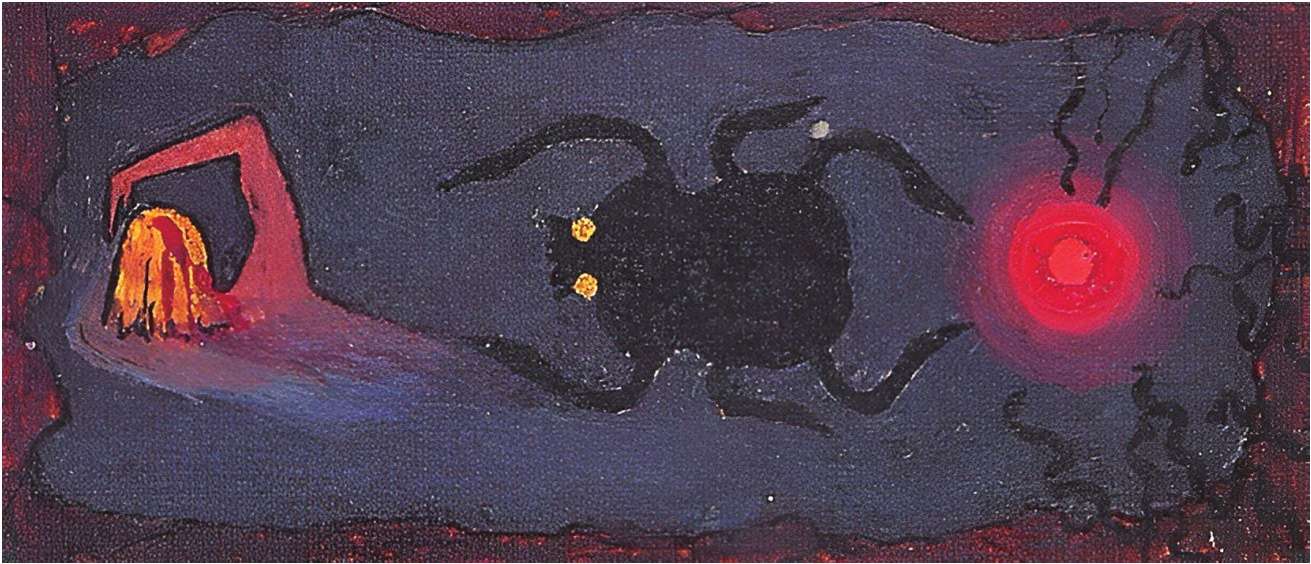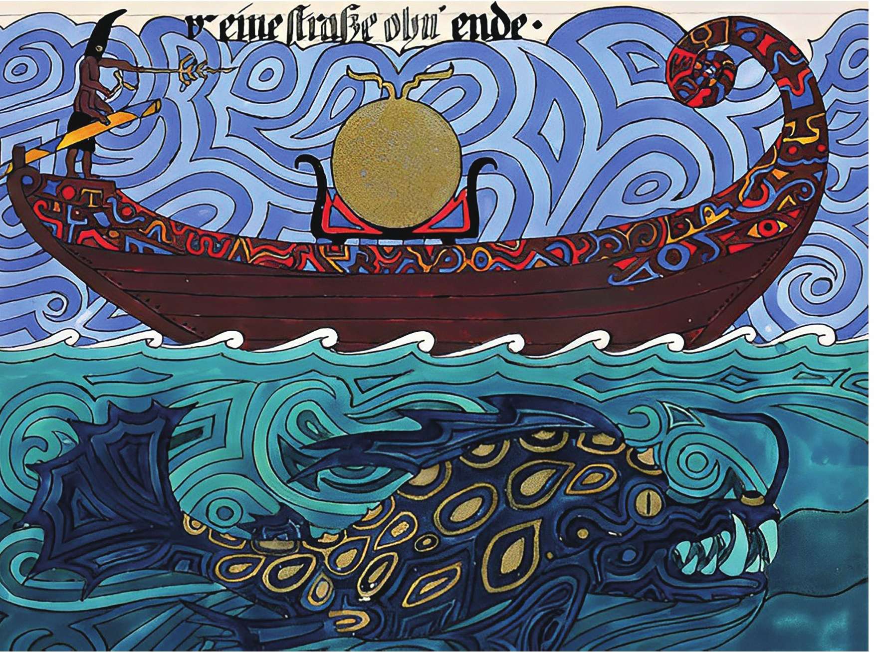 荣格所画的幻想中的太阳船。在埃及神话中,太阳神与怪物进行战斗,怪物试图在太阳船每天于天空穿梭时吞掉它。荣格认为与怪物的战斗象征自我意识试图摆脱无意识的控制。