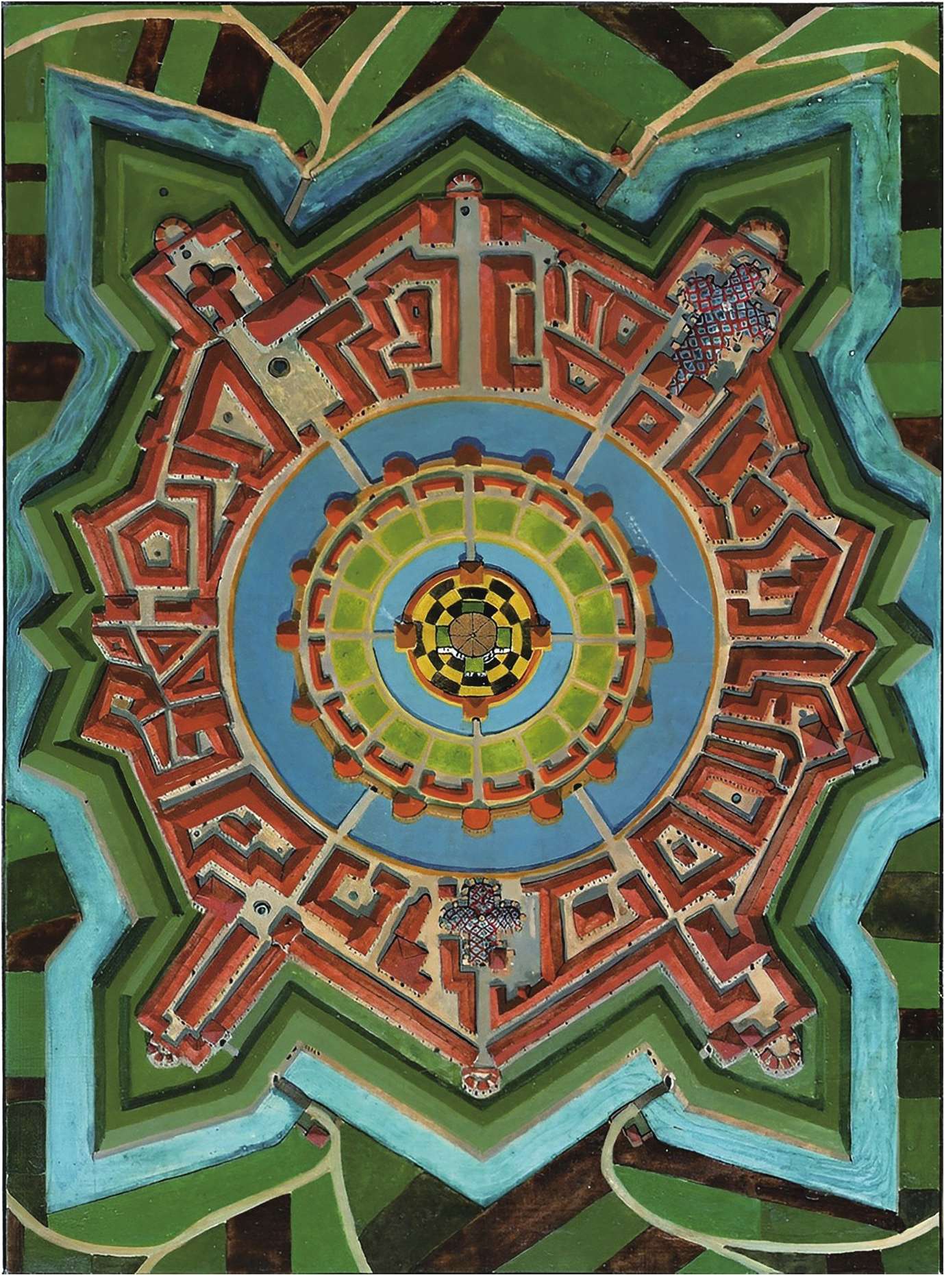荣格所画的曼荼罗。他称这幅曼荼罗就像由城墙和护城河守备的城市。画的中心是金顶城堡,城堡中间是一座金色神庙。