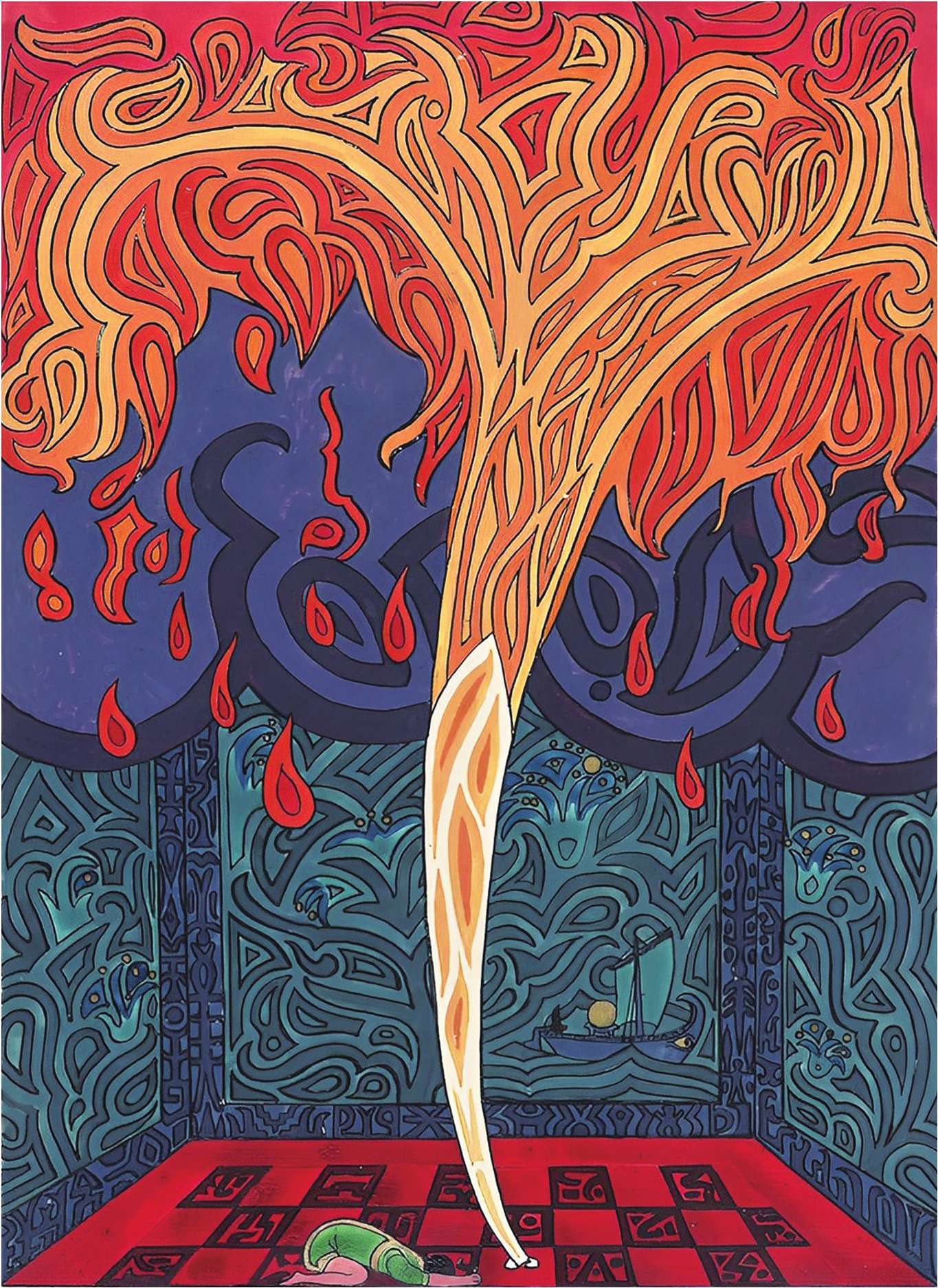 荣格所画的幻想中的太阳船。在埃及神话中,太阳神与怪物进行战斗,怪物试图在太阳船每天于天空穿梭时吞掉它。荣格认为与怪物的战斗象征自我意识试图摆脱无意识的控制。