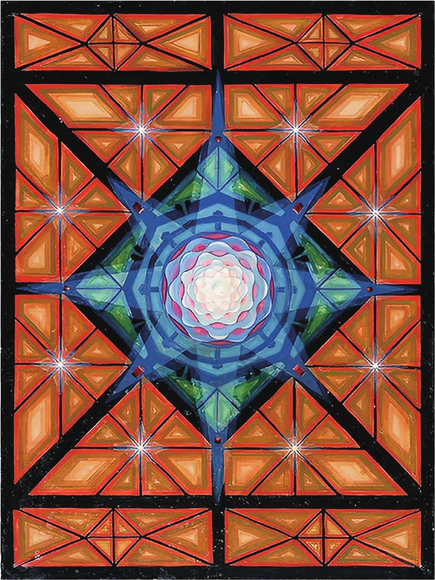 荣格所画的曼荼罗。他称这幅曼荼罗就像由城墙和护城河守备的城市。画的中心是金顶城堡,城堡中间是一座金色神庙。