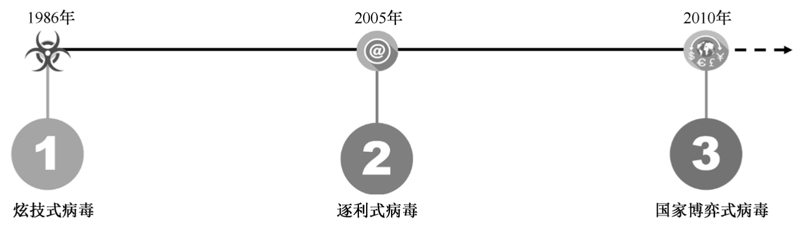 尽管说计算机病毒是一种能自我复制的人工生命体,但其仍未脱离程序代码的范畴。作为程序代码的计算机病毒,主要由计算机病毒编写者创作完成。计算机病毒的发展历程从来都离不开病毒编写者的发挥与参与。从严格意义上说,尽管目前人工智能技术可赋能计算机病毒,使其拥有更多智能,但计算机病毒的发展仍由病毒编写者主导,编写者的现实思维会直接映射到计算机病毒结构与功能甚至智能上。所谓的智能化病毒,也只是编写者采用了人工智能技术与方法后,赋予计算机病毒智能化选择传播途径、感染方式及负载运行方式而已。因此,从病毒编写者视角来梳理计算机病毒的发展,更能透视与展现计算机病毒发展背后人的对抗与人性的显现,从而有助于深度理解计算机病毒发展的底层逻辑。从这个视角看,计算机病毒大致经历了“炫技式病毒—逐利式病毒—国家博弈式病毒”发展路线(见图1-13)。