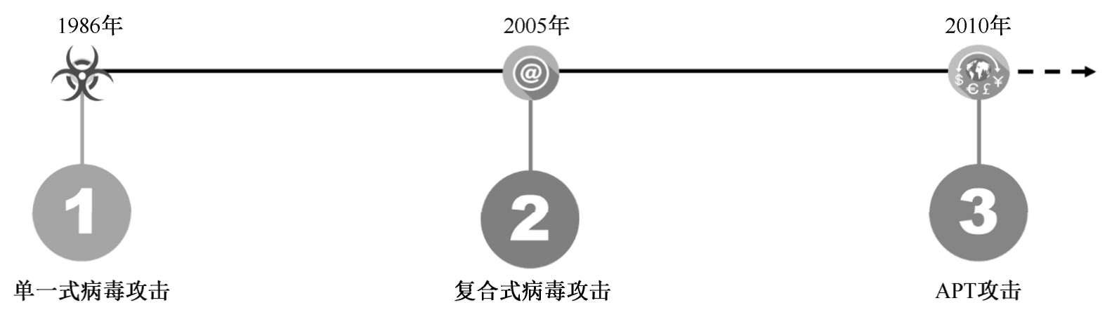 纵观计算机网络攻击史,计算机病毒作为攻击载体的中坚地位一直未变,且可预测未来仍会如此。计算机病毒就是以实施攻击为其使命而诞生的。1986年,巴基斯坦兄弟病毒(C-Brain病毒)是为攻击盗版者而编写的,目的是删除盗版软盘者的数据。自诞生以来,计算机病毒一直是作为攻击载体而存在的。从攻击载体的视角来看,计算机病毒始终遵循“从简单到复杂,从低级到高级,从单一到复合”的进化发展逻辑,大致经历了“单一式病毒攻击—复合式病毒攻击—APT攻击”发展路线(见图1-12)。