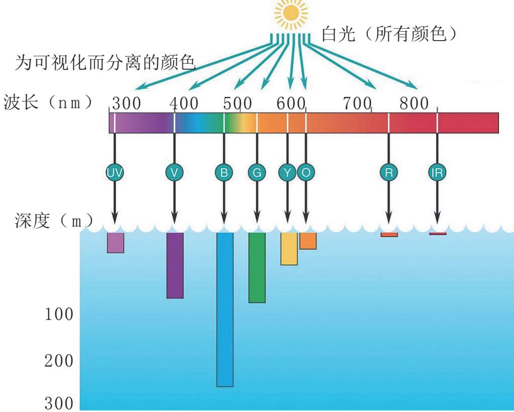 在回答这个问题之前,我们先要抬头望一望太阳。绚烂的阳光是由红、橙、黄、绿、青、蓝、紫七种颜色的光合成的。光线的颜色不同,波长也就不同。而海水对于不同波长的光线,无论是吸收、反射还是散射,都有自己的“偏好”。